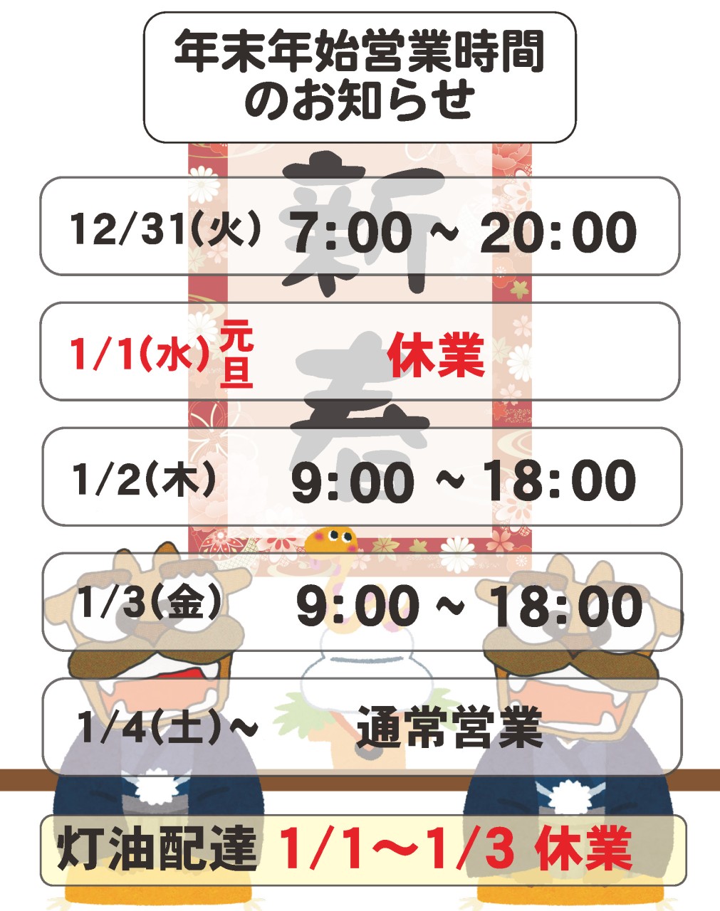 🎍2024-2025年 年末年始営業時間のお知らせ🎍 2024年12月28日 最終更新日時 : 2024年12月28日 5vkkx6da 日頃より灯油配達並びにハローシーサーSSをご利用頂きありがとうございます。ハローシーサーSS各店は12月31日、1月2日・3日は営業時間を短縮、1月1日はお休みとなりますので、ご注意下さい!灯油配達につきましては1月1日~1月3日はお休みとなります。お客様にはご不便をおかけしますが、ご理解・ご協力の程よろしく願いいたします。来年もよろしくお願いいたします✨ \ 最新情報をチェック / Bluesky