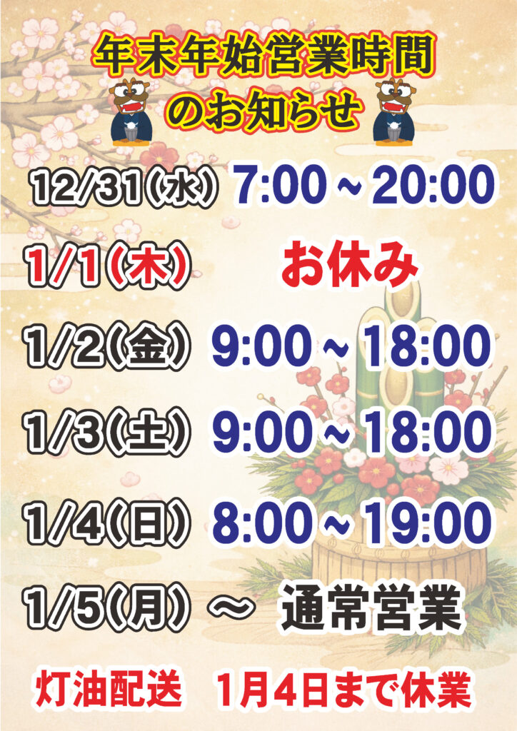 🎍2025-2026年 年末年始営業時間のお知らせ🎍 2025年12月31日 最終更新日時 : 2025年12月31日 5vkkx6da 日頃より灯油配達並びにハローシーサーSSをご利用頂きありがとうございます。ハローシーサーSS各店は12月31日、1月2日・3日は営業時間を短縮、1月1日はお休みとなりますので、ご注意下さい!灯油配達につきましては1月1日~1月4日はお休みとなります。お客様にはご不便をおかけしますが、ご理解・ご協力の程よろしく願いいたします。来年もよろしくお願いいたします✨ \ 最新情報をチェック / Bluesky